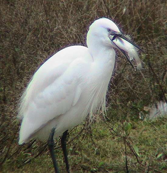 | Goosander Hersey NR, 2nd Dec. | Lapland Bunting (Juv) Whale Chine, 16th Nov. | Little Egret & Fish, Hersey NR, 16th Nov. | Black Redstart (F) Needles Battery, 9th Oct. |